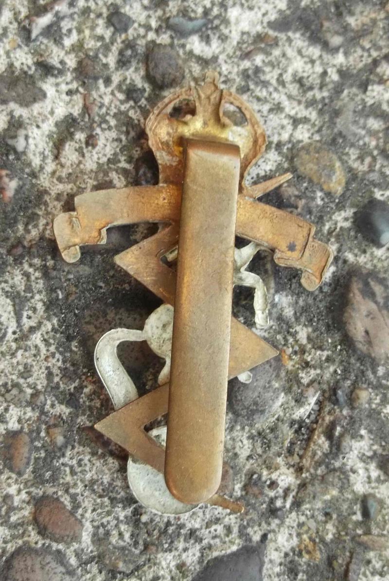 a well used early post WW2 second pattern cap badge. approx 1.8" by 1.2" with plain slider fitting. Crown of King George VI. Was in use about 1946 to 1947 until 1952.