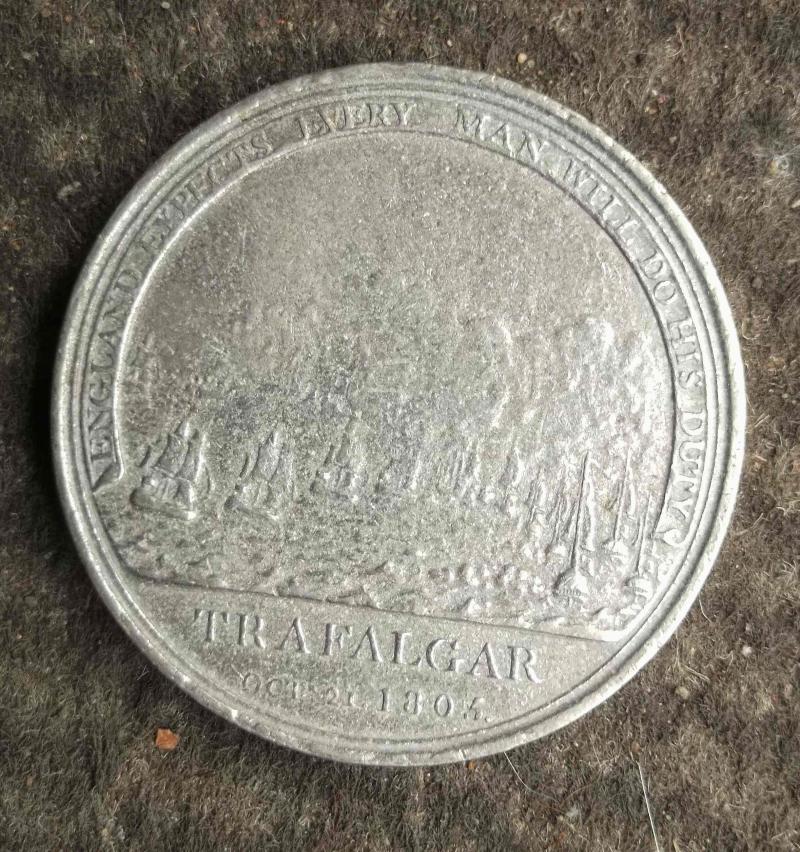 a fairly good looking coated light base metal copy of tn his RN medal produced by Boulton. approx. 1.75" diameter. inscription on edge.