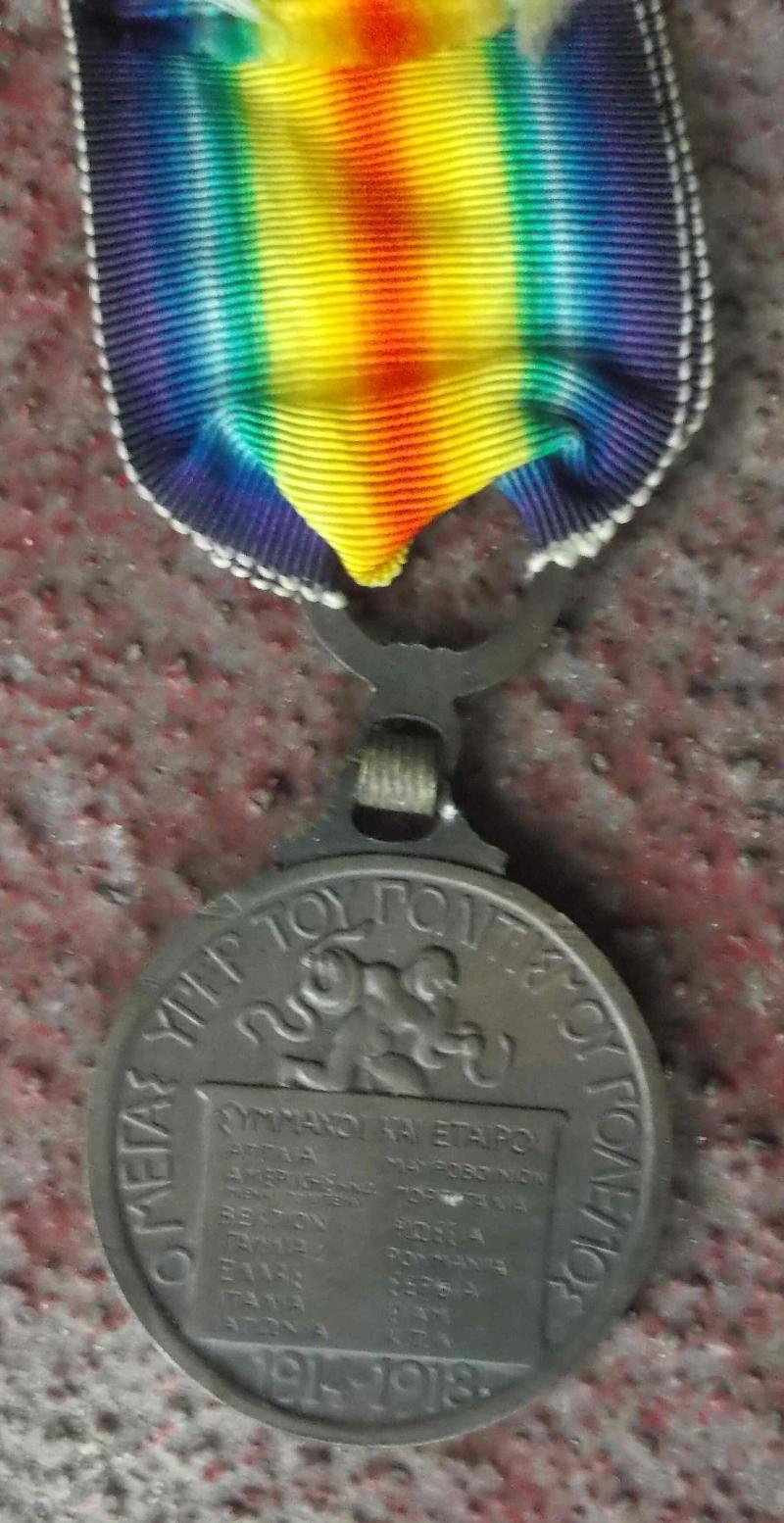 interesting version of the Inter-Allied Victory Medal. This one is a campaign medal issued by the Greek authorities, commemorating the Allied victory in the First World War. approx 1.4" diameter plus fittings and ribbon. reasonable condition.