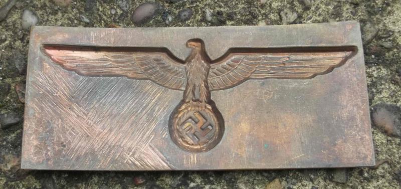 a circa late WW2 era picked up struck brass uniform emblem approx 4" by 1.75". This one was either classed as a defect or just not finished. one of a number picked up by a veteran in Germany. intended for Officers and WOs.