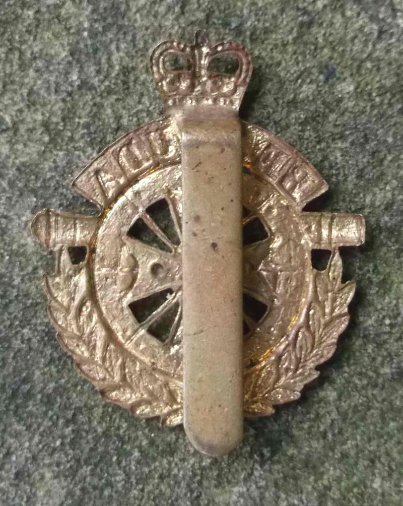 an interesting early post amalgamation era cap badge approx 1.75" by 1.5" with plain lug type fitting. Crown of Queen Elizabeth II at top. Mostly Territoroiial Army as far as i am aware.sold as is .