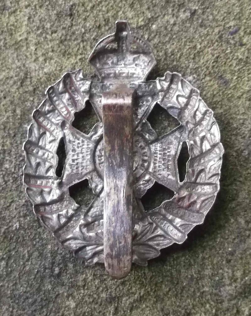 a well used but reasonable example cap badge from around WW2. approx 1.85 by1.6" with plain slider type fitting on the reverse. looks like it may have been mounted on a display etc at some time also.