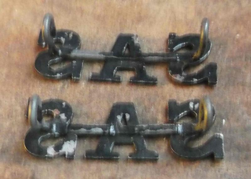 a pair of blackened light metal shoulder titles from the pre Zimbabwe era. each approx by with lug type fittings. reasonable example with signs of handling etc.