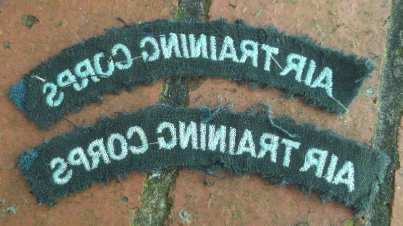 a pair of Cold War era sew on titles in well used condition each approx 5" by 1". Cadet titles affiliated to the RAF.