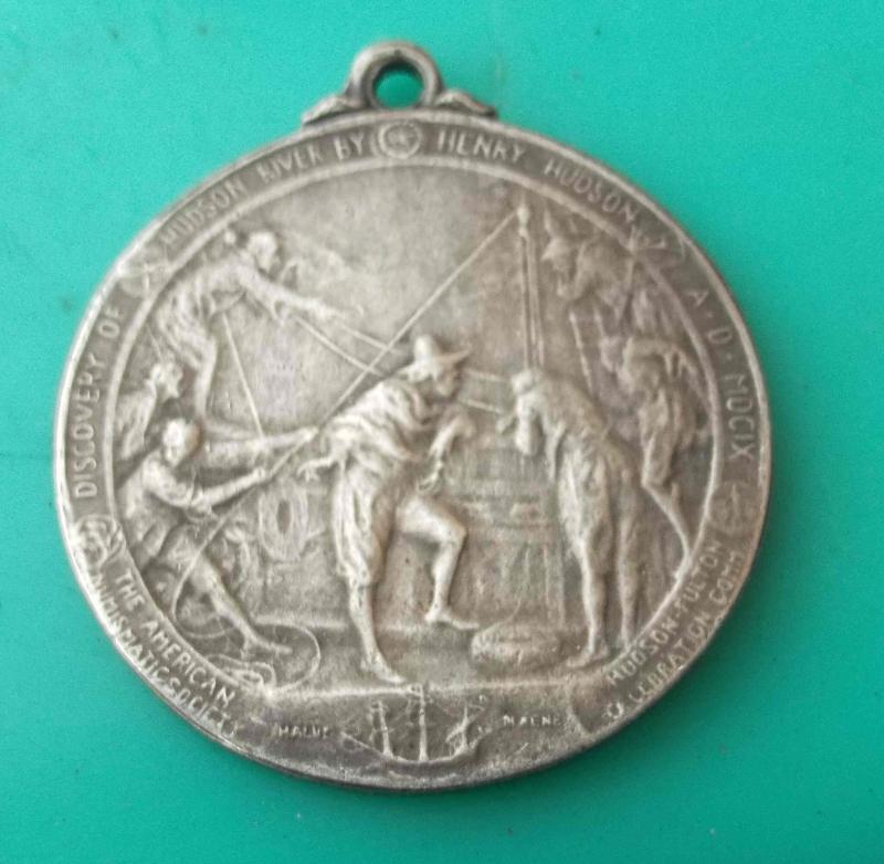 an interesting one. hard metal US commemorative approx 1.25" by 1.5" Could be clased as eithera medal or medallion i guess. signs of age and handling etc.