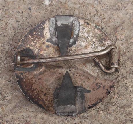 a good example white metal or heavily plated pin back badge. believed circa Great War era. approx 1.5" diameter. also has some unusual retention prong fittings.