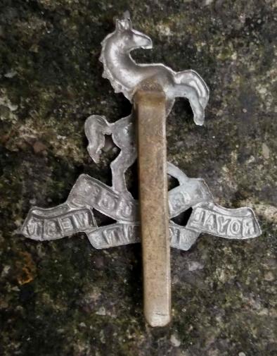 a reasonable example hard white metal cap badge of this former regiment. approx 1.65" by 1.75" with a long plain brass slider type fitting.