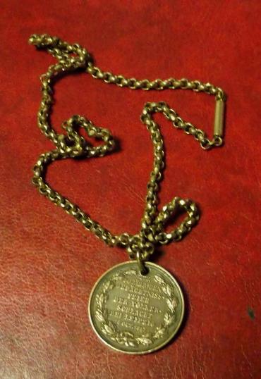 a bronze commemorative medal apparently given to school children in Weimar for the 50th anniversary of the Battle of Leipzig or Battle of the Nations. . Approx 1.15" diameter. has been drilled and hung from an old probably rolled gold chain.