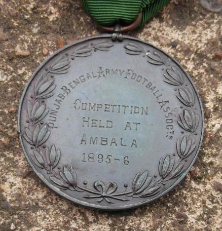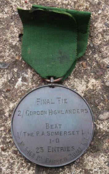 Ambala 1895 to 1896. an unusual British Army India Victorian era sports medal for a Football Competition match between the 2nd Battalion Gordon Highlanders and the 1st Battalion Somerset Light Infantry {Prince Albert's}. The Gordons won so a runners up medal to Private 3468 Alfred Carter of the Somersets. comes with some research.