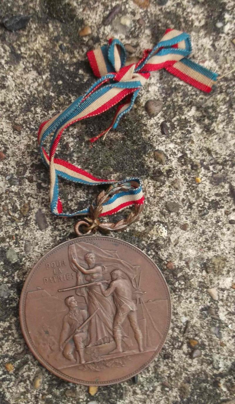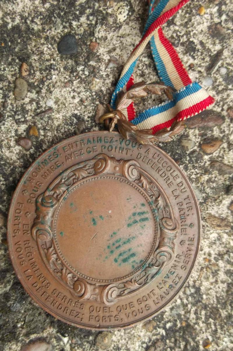 a patriotic style old french shooting medal approx diameter. signs of age. still has red white and blue tie up.