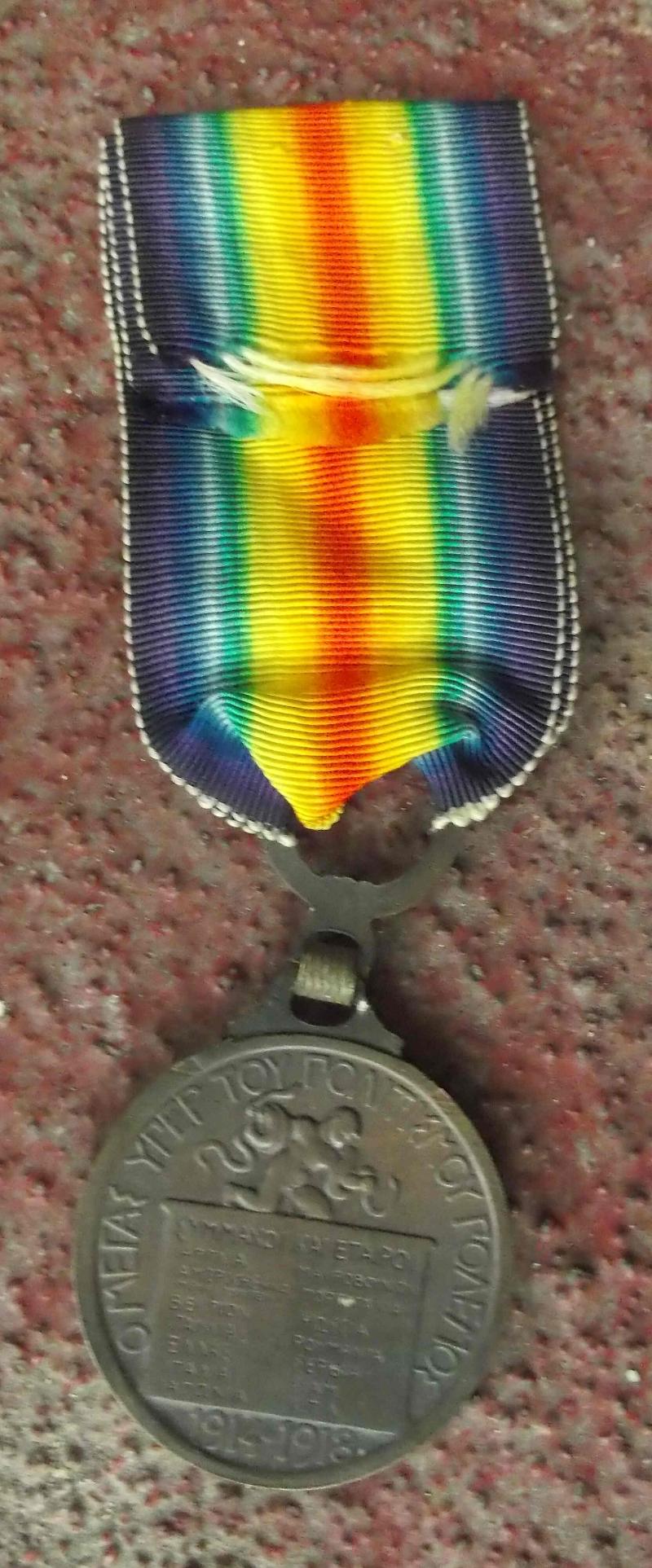 interesting version of the Inter-Allied Victory Medal. This one is a campaign medal issued by the Greek authorities, commemorating the Allied victory in the First World War. approx 1.4" diameter plus fittings and ribbon. reasonable condition.