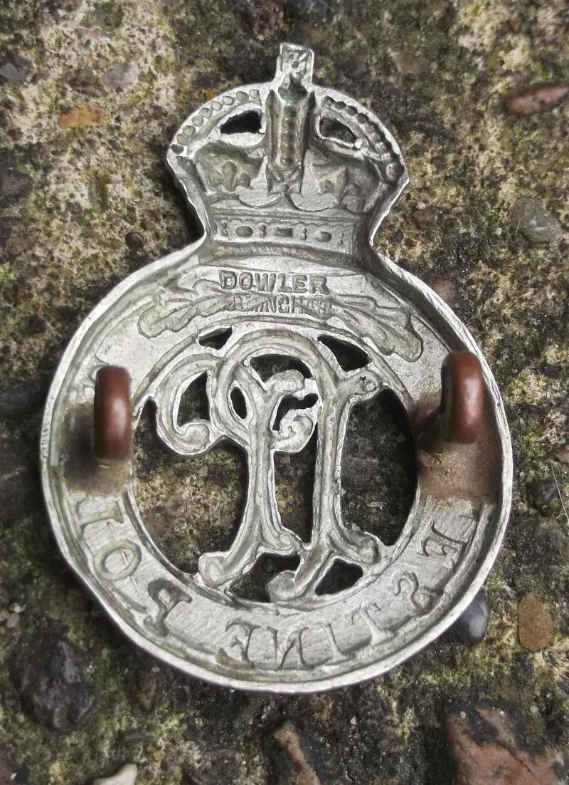 a small pattern former PP badge . approx 1.75" by 1.25" with lug type fittings and Kings Crown at top. signs of use and age. Fairly sure this type was used as a cap badge but may have had other purposes. Sold as is. Maker marked by Dowler. From around 1920 to 1948.