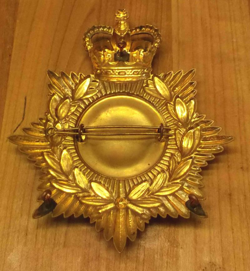 a well used but less common helmet plate bearing the crownof Queen ElizabethII. Former regiment use approx 5.25" by 4.25"cwith lug fittings on the reverse. signs of age , use and a few stains etc.