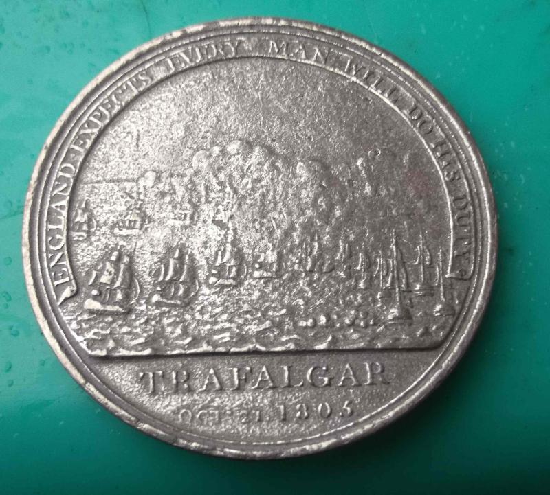 a fairly good looking coated light base metal copy of tn his RN medal produced by Boulton. approx. 1.75" diameter. inscription on edge.