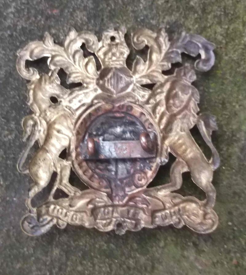 an altered version of a Civil pattern UK or possibly Commonwealth dieu et mon droit emblem badge approx 2.25" by 2" with replaced rear fitting . interesting one.