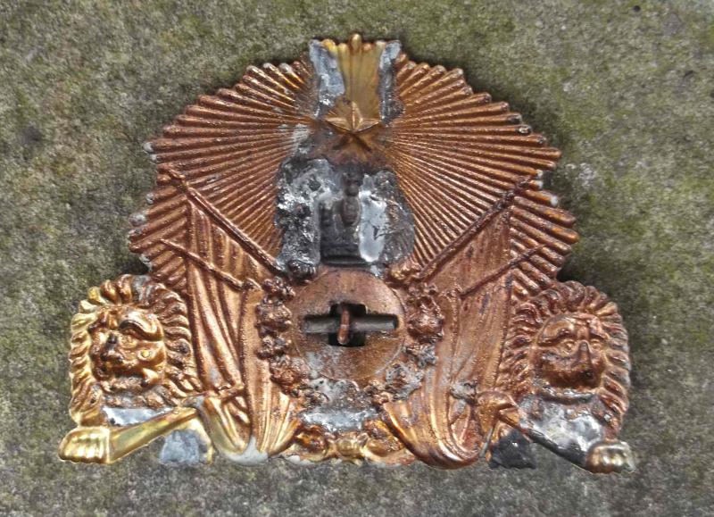 a vintage believed circa 1880s looks like a repaired helmet plate although alot i have seen look about the same on the back. sold as seen. approx 4.7" by 3.7". blank centre piece so no idea of which unit that is. no fittings on the reverse remaining either.